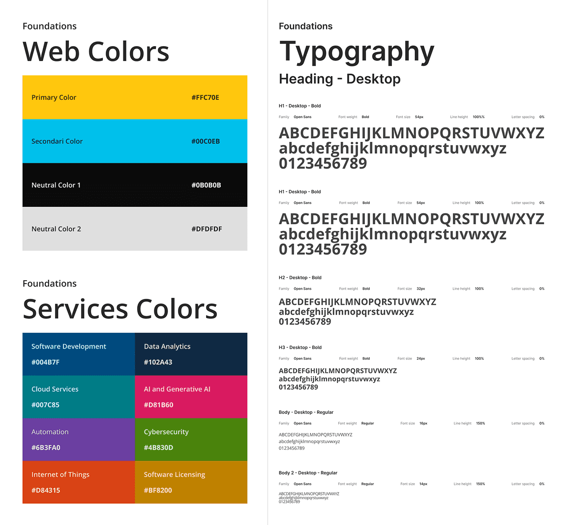 With the structure well-defined, it was time to give personality and visual cohesion to Valtec’s website. A solid visual identity was created: a single icon library (Bootstrap Icons) was selected, and typography and its sizes were precisely defined for the entire text hierarchy (titles, subtitles, labels, and descriptions) in semibold and regular variants.